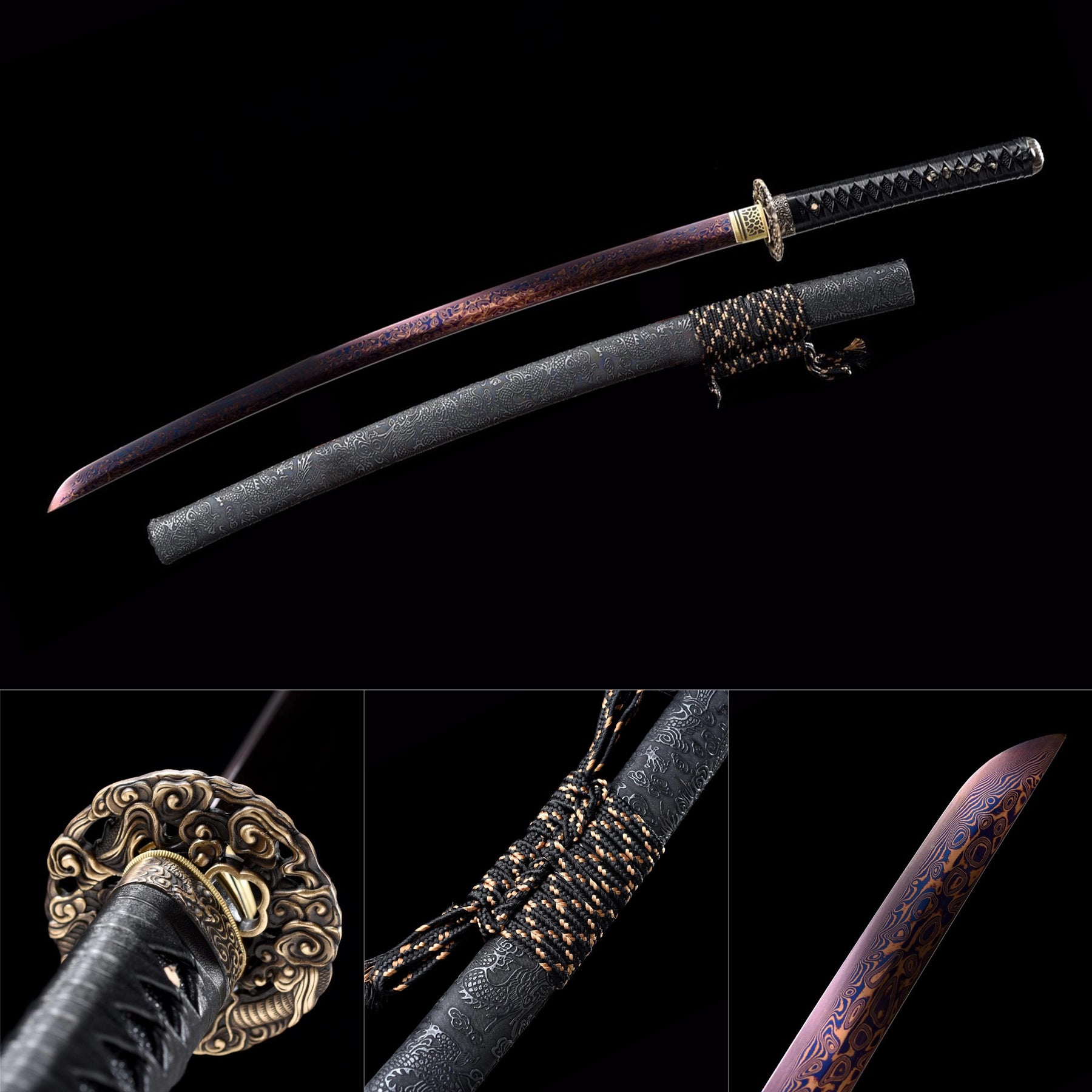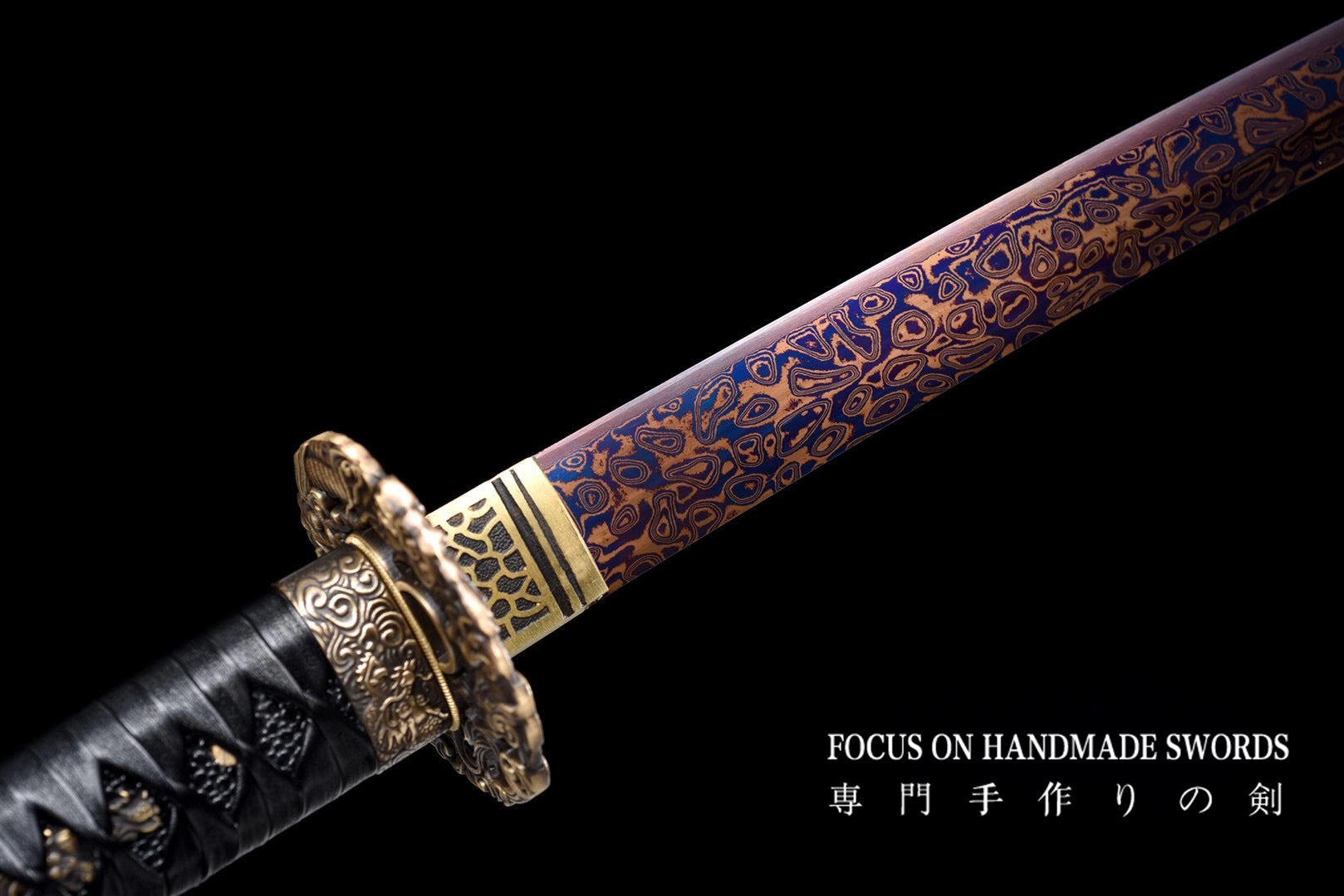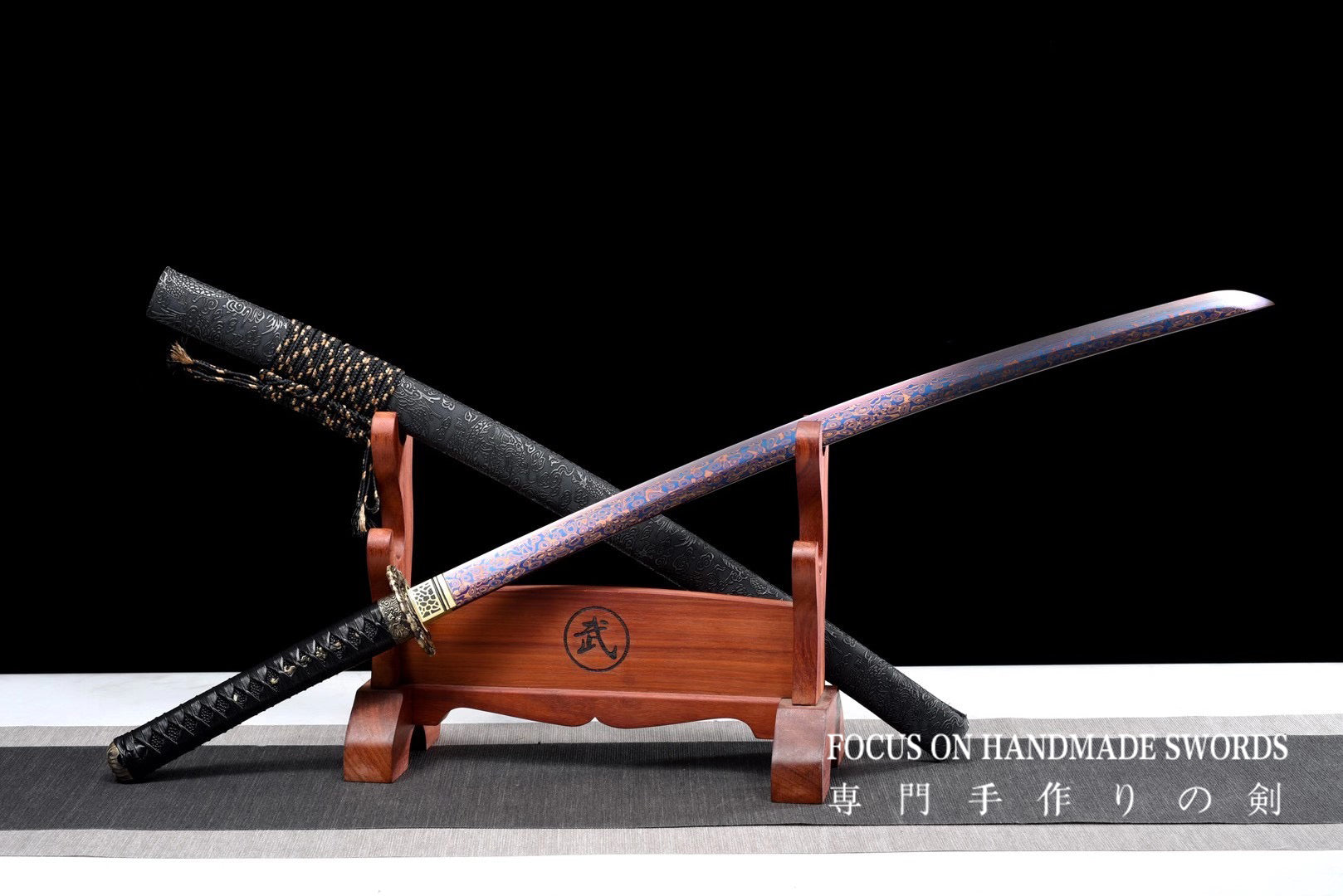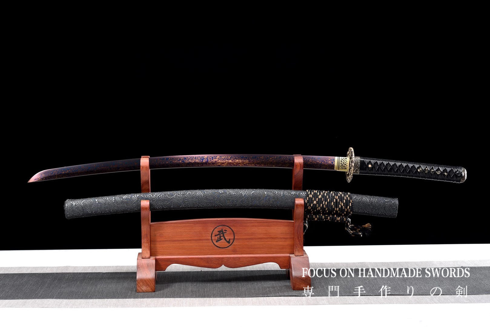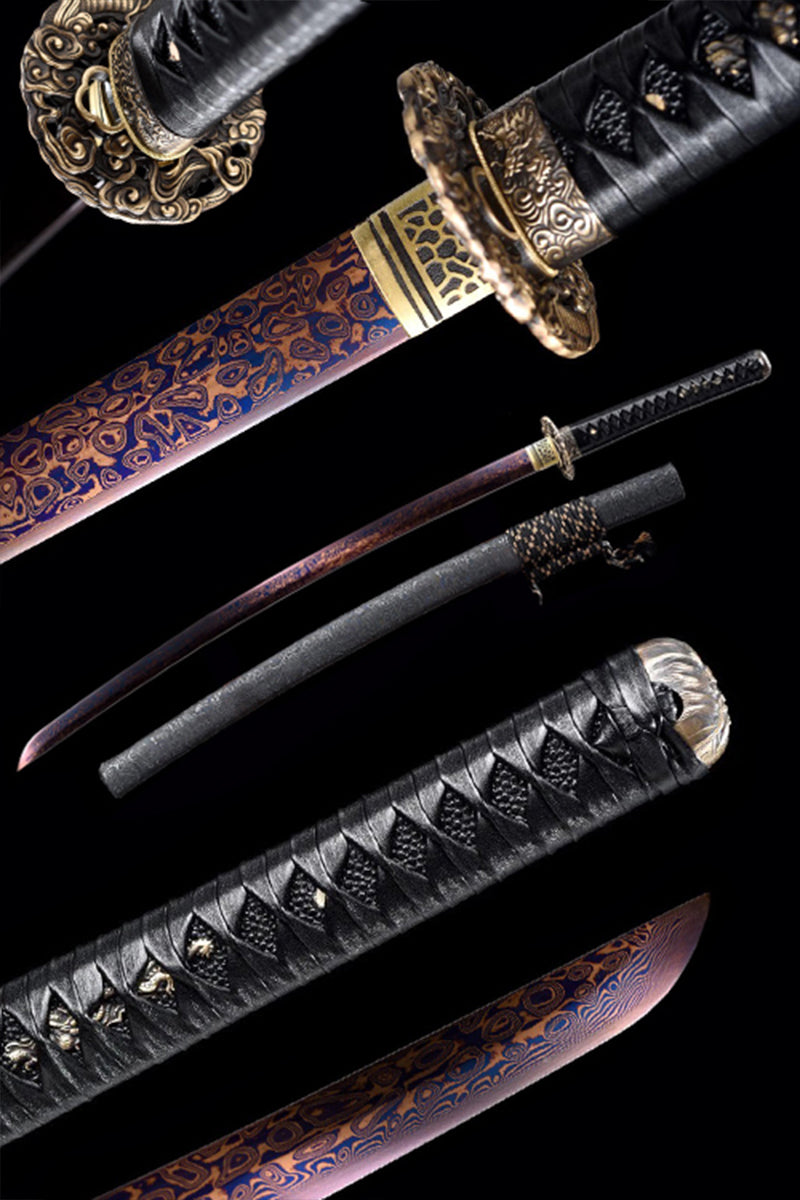 Unleash the spirit of the samurai with this exquisite hand-forged Katana. The folded steel blade showcases a mesmerizing layered pattern, a testament to traditional Japanese smithing. What truly sets this sword apart is its unique color-treated finish, adding a modern and striking visual appeal. Housed in a durable and elegant leather scabbard, this Katana is a perfect blend of ancient artistry and contemporary style. Ideal for collectors, martial arts practitioners, or as a stunning display piece, it embodies strength, beauty, and the rich heritage of the Japanese samurai.
