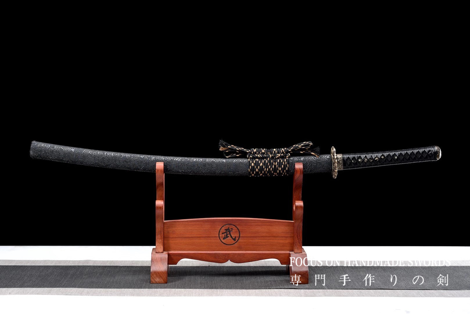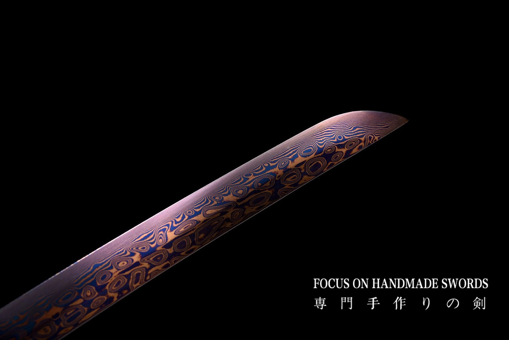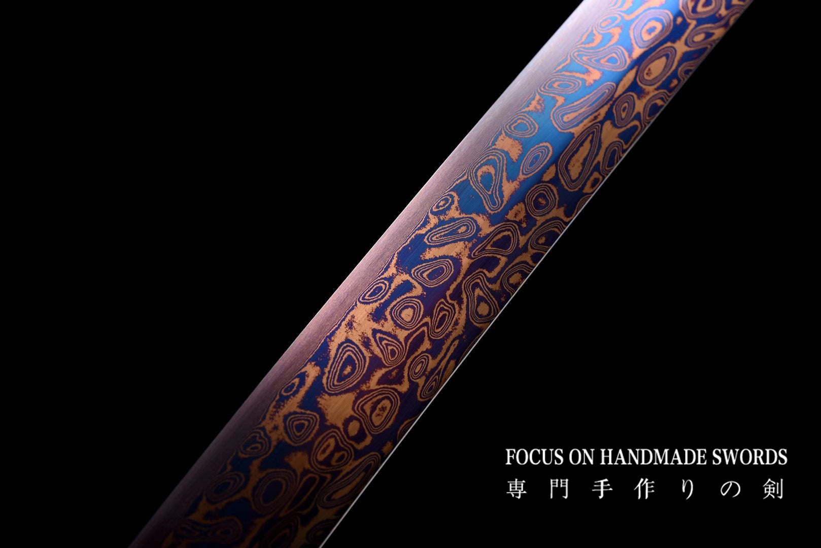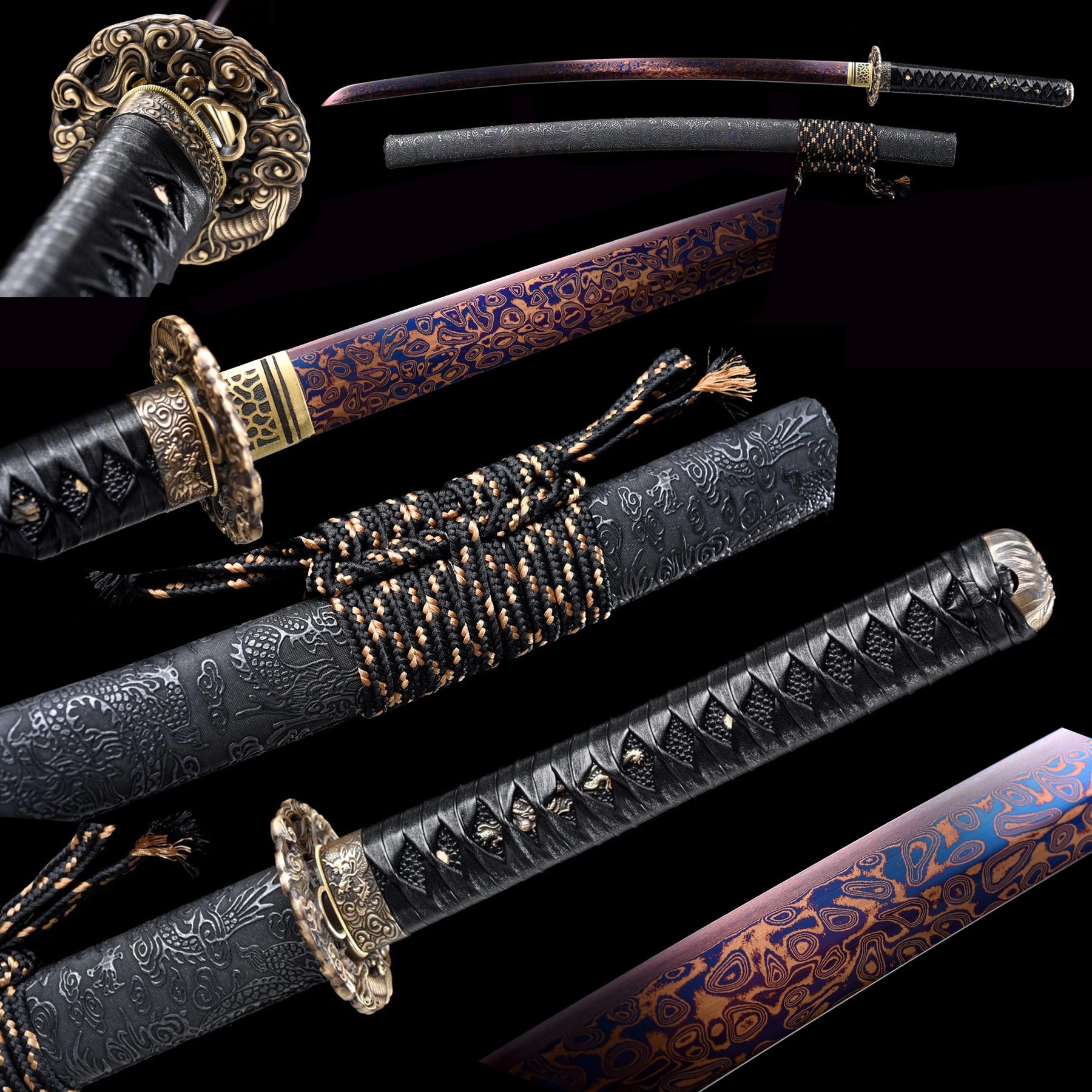 Unleash the spirit of the samurai with this exquisite hand-forged Katana. The folded steel blade showcases a mesmerizing layered pattern, a testament to traditional Japanese smithing. What truly sets this sword apart is its unique color-treated finish, adding a modern and striking visual appeal. Housed in a durable and elegant leather scabbard, this Katana is a perfect blend of ancient artistry and contemporary style. Ideal for collectors, martial arts practitioners, or as a stunning display piece, it embodies strength, beauty, and the rich heritage of the Japanese samurai.
