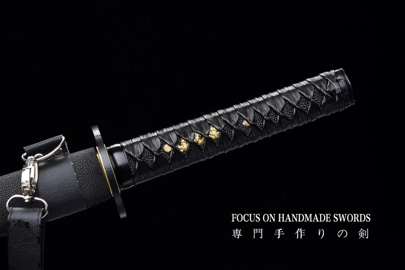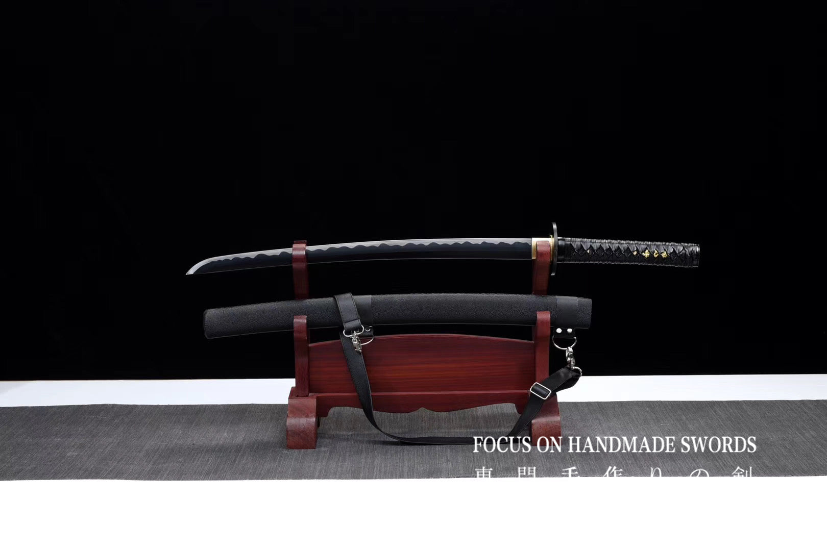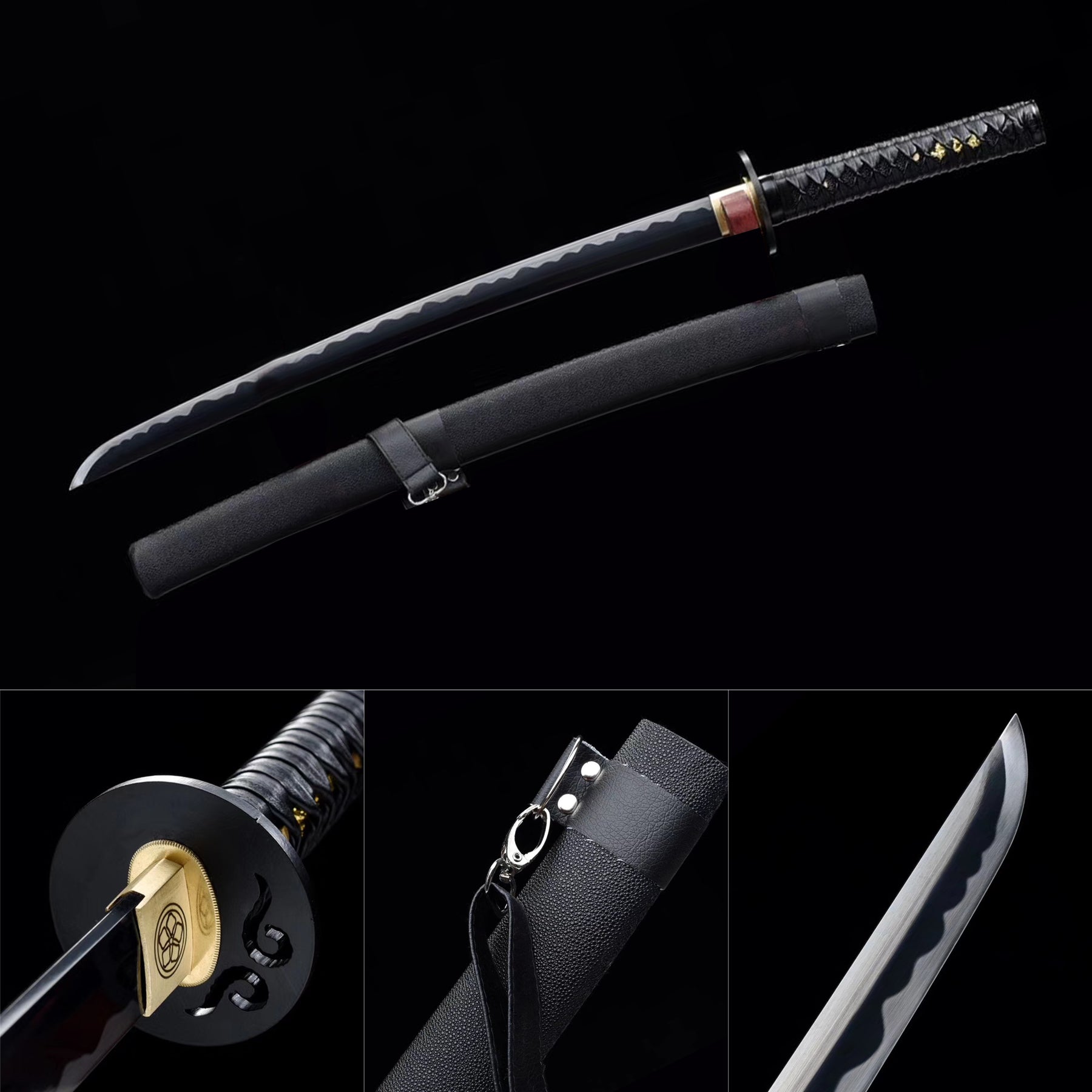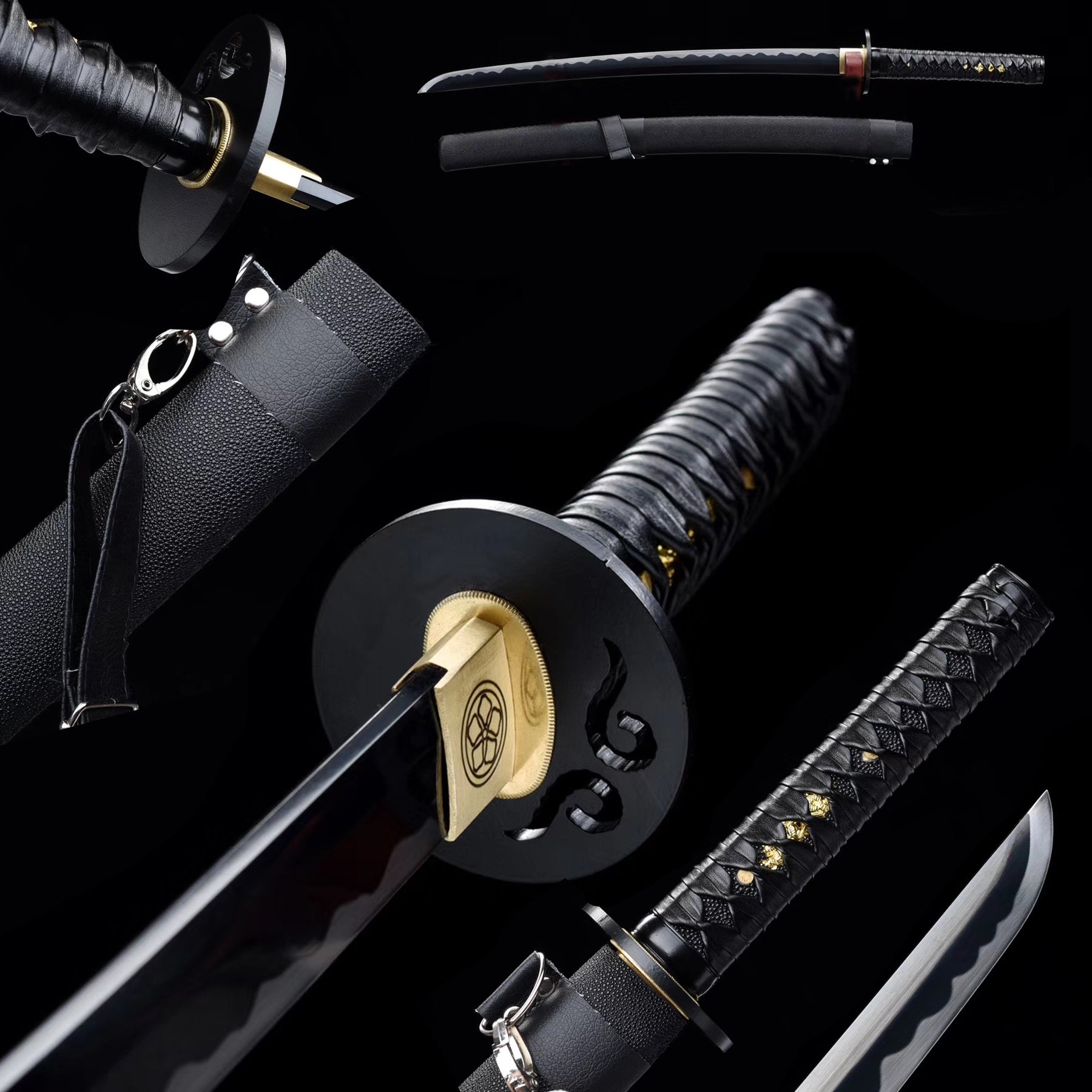 Handmade Katana Manganese Steel Color Treated Black Blade Samurai Swords Wakizshi Leather